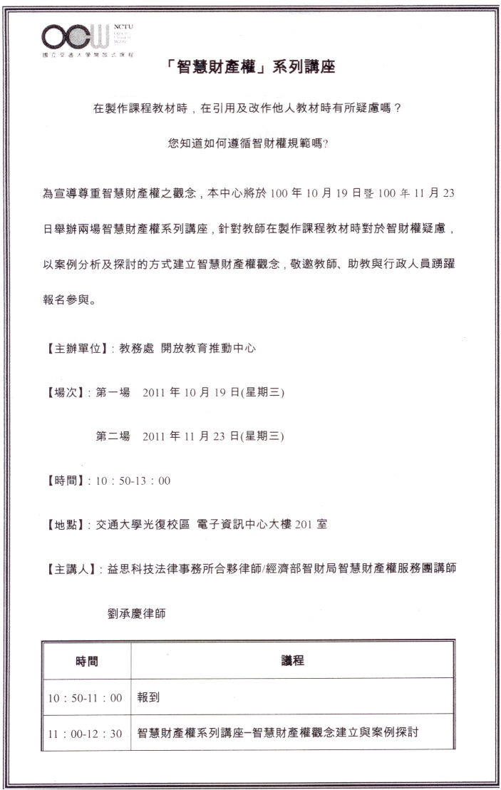 國立交通大學於100年10月19日及11月23日舉辦兩場「智慧財產權系列講座」